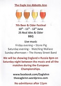 The Eagle Inn Abbotts Ann 7th Beer & Cider Festival l0th, 11th and 12th June 25 Real Ales and Cider BBQ Live music Friday evening – Stone Pig Saturday evening – Watching Wallace Sunday afternoon – The Honey Street Band We will be showing England v Russia 8pm on Saturday night between the …