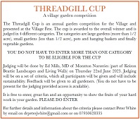 THREADGILL CUP A village garden competition The Threadgill Cup is an annual garden competition for the Village and presented at the Village Fete. The cup is awarded to the overall winner and is judged in 4 different categories. The categories are large gardens (more than 1/2 acre), small gardens (less than 1/2 acre), pots and …