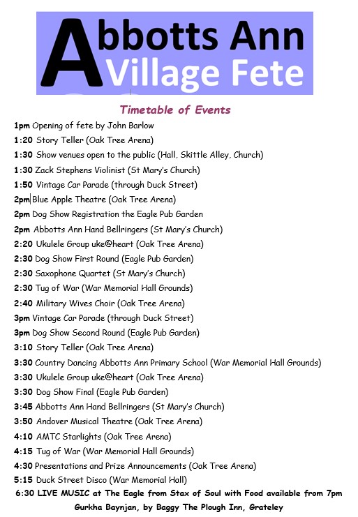 Introduction to the Abbotts Ann Village Fete Village Fete The village fete is usually on the 1st Saturday in September starting at 1pm, and is held either in the village centre or up at Bulbery playing field. This year the fete is on Saturday 6th September 2025, from 1pm, and will be held in the village …